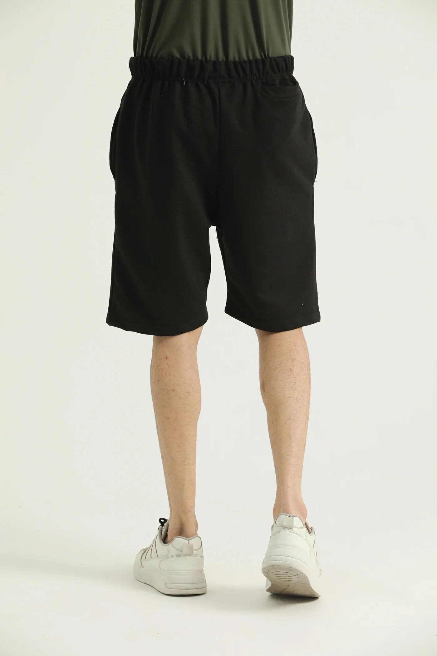 A man standing, wearing black mid-length knit shorts and white sneakers.