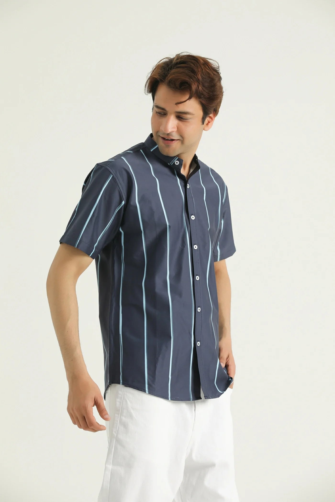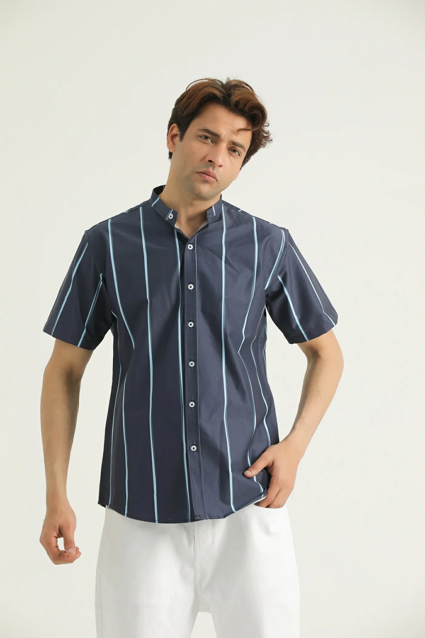 Add a pop of pattern to your wardrobe with this Men’s Navy Short-Sleeve Shirt featuring eye-catching light blue vertical stripes. Made from lightweight fabric, it offers a comfortable fit and a crisp, structured look—perfect for both casual and semi-formal occasions. The button-down front and short sleeves make it an easy choice for warm-weather days.