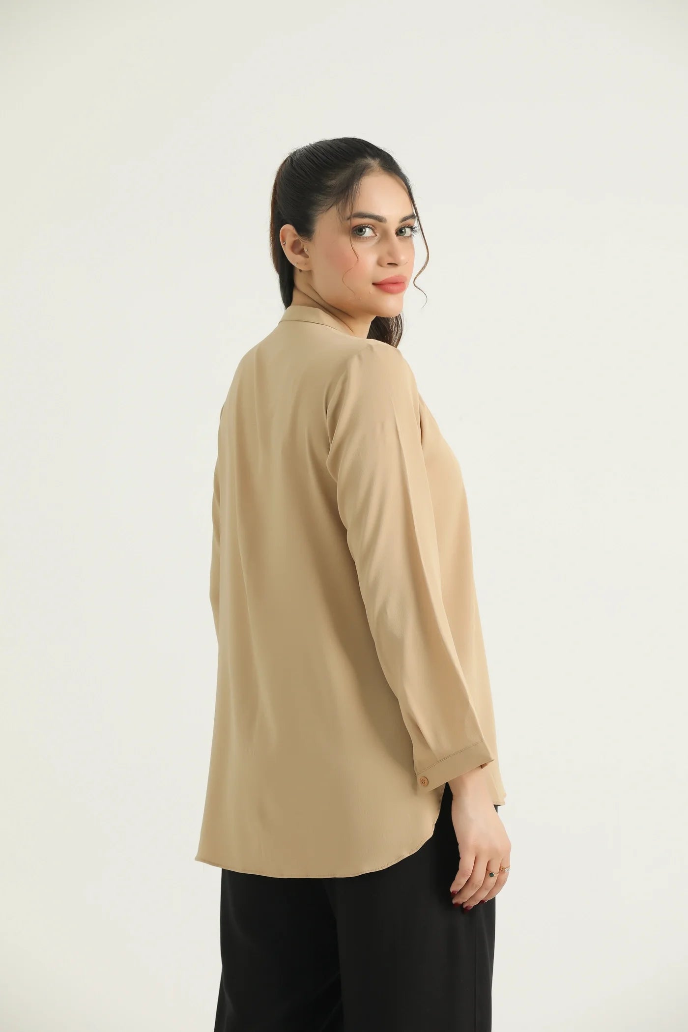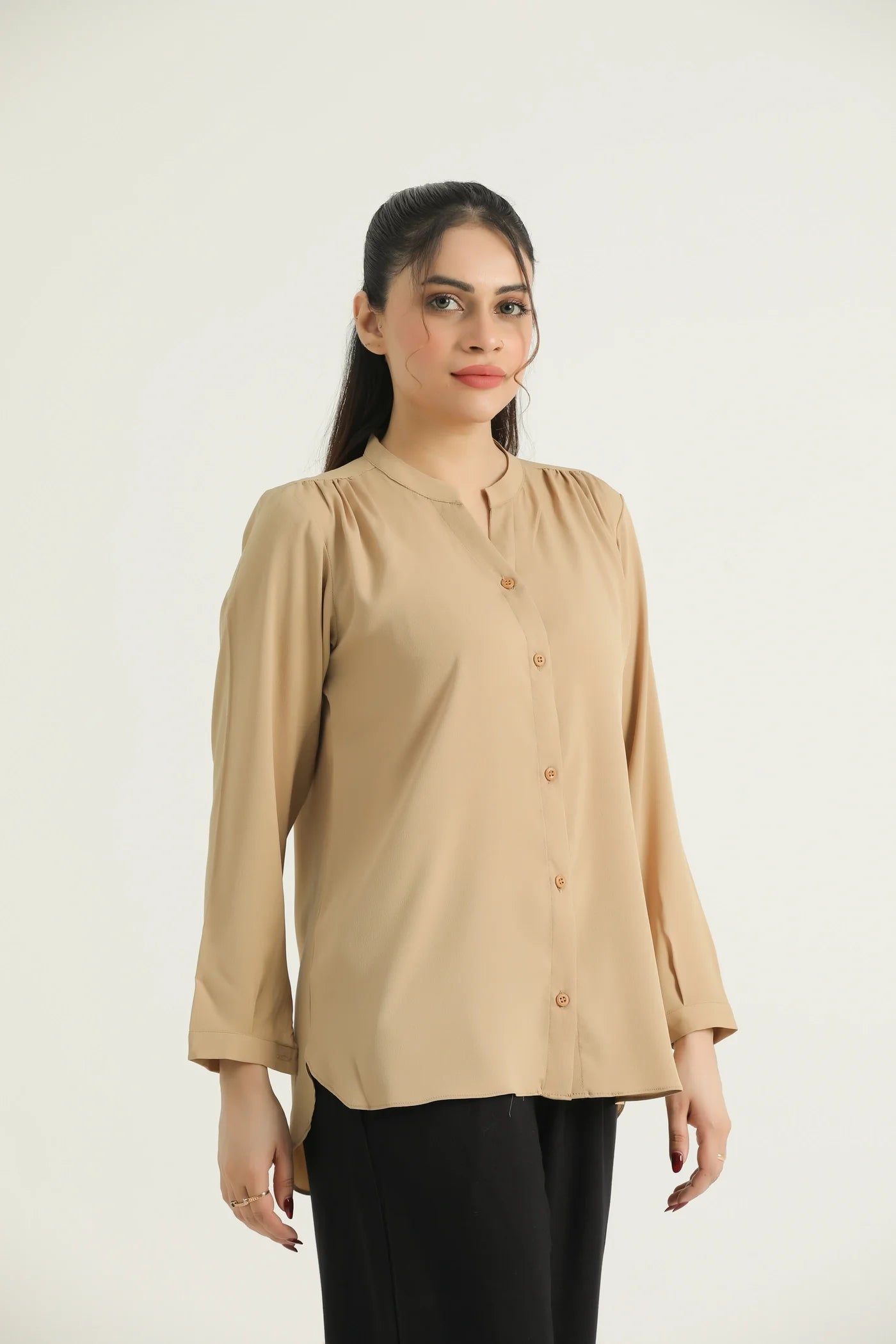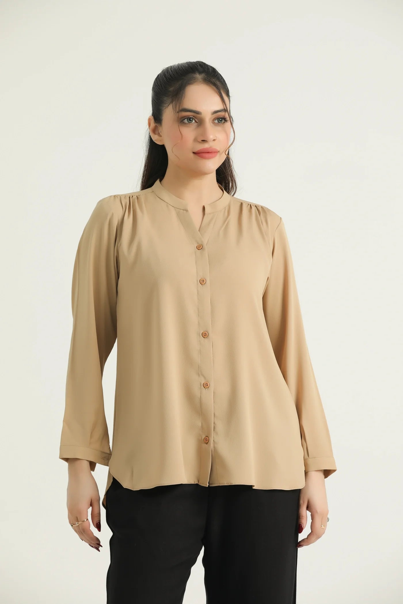 Timeless and versatile, this beige full-sleeve blouse is a wardrobe essential crafted from a subtly textured, lightweight fabric that offers comfort and elegance in equal measure. Featuring a band collar and full button-down front, this top blends structure with softness for a refined everyday look. The gentle gathers at the shoulders add a hint of volume, while the long sleeves with buttoned cuffs provide a polished finish. Its neutral tone makes it perfect for effortless styling across seasons.