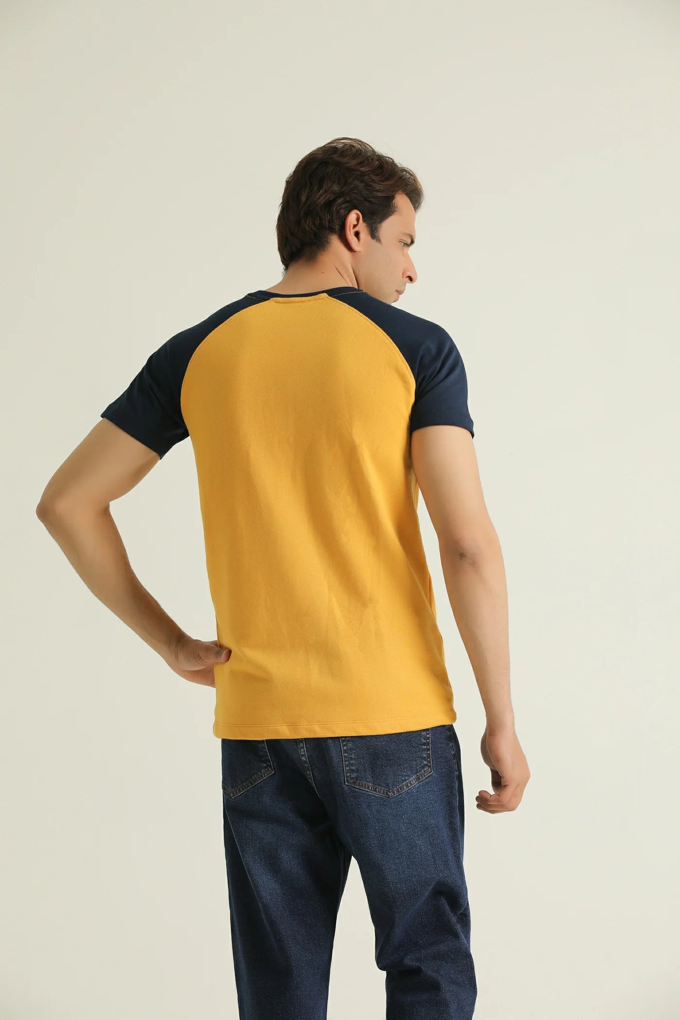 Striking Color Contrast: Vibrant mustard yellow body paired with deep navy raglan sleeves.