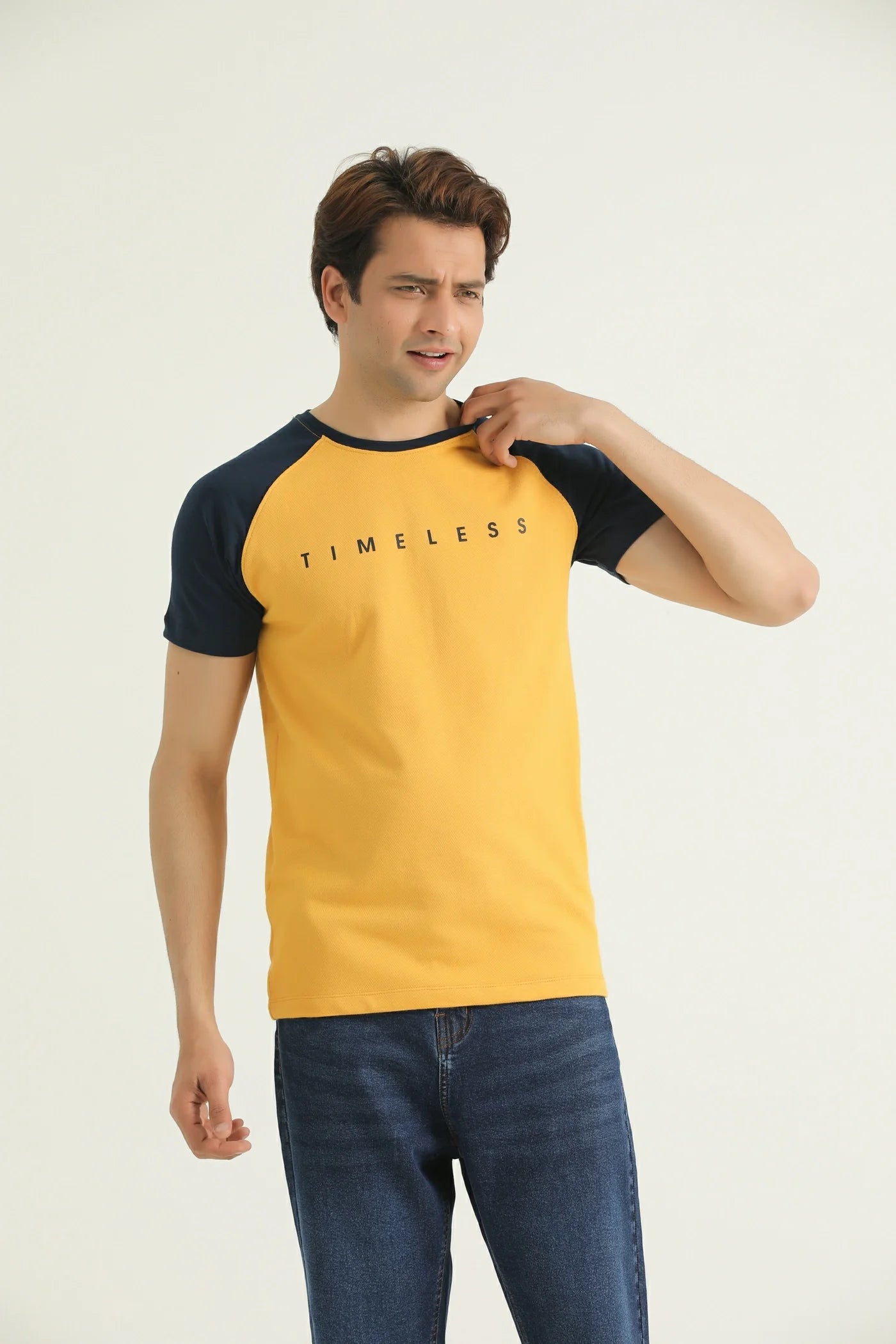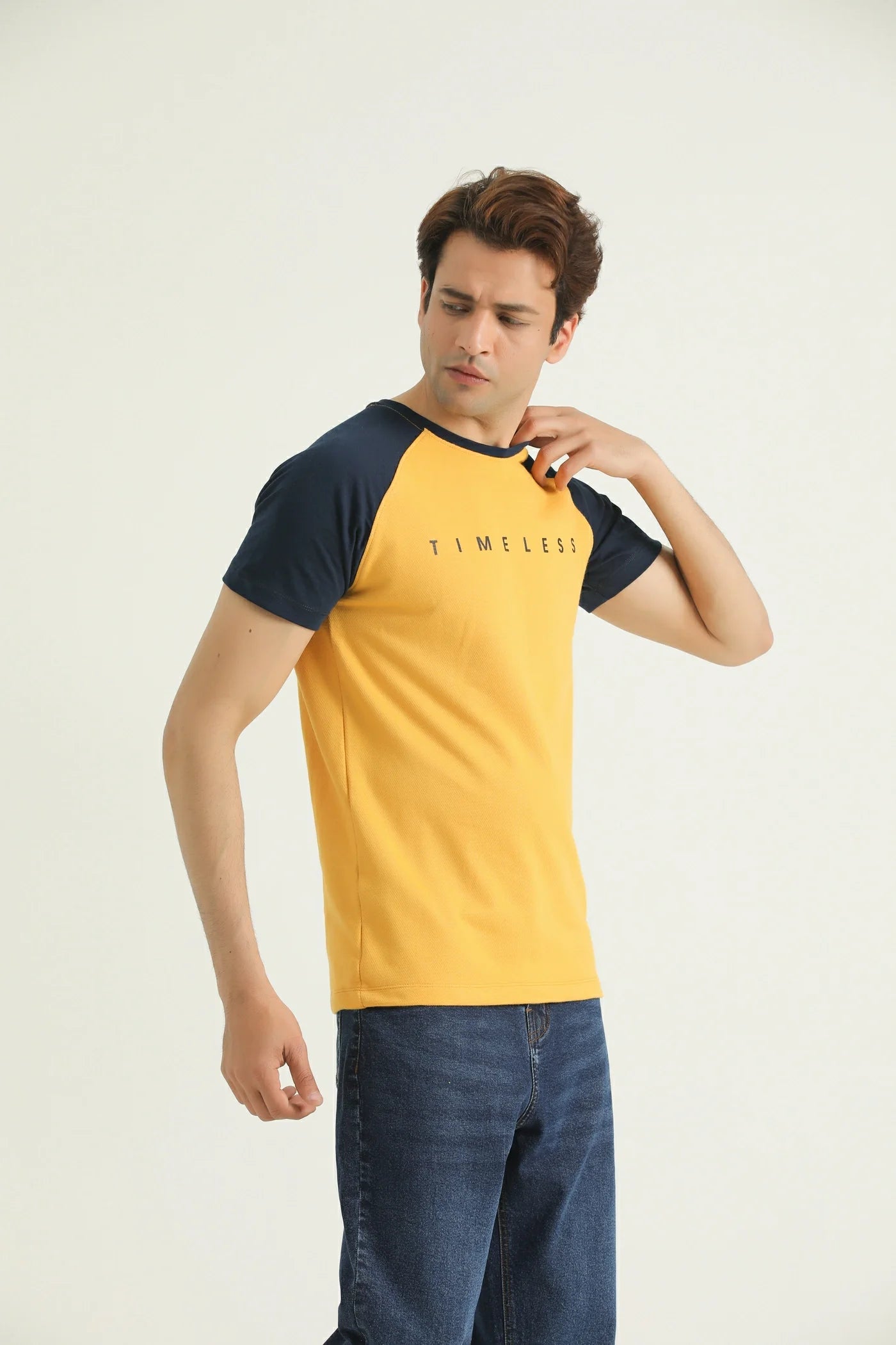 Embrace classic style with a modern twist in our "Timeless" Mustard & Navy Raglan Tee. This eye-catching t-shirt features a vibrant mustard yellow body, subtly enhanced with an all-over textured knit pattern for added depth and character. The contrasting dark navy raglan sleeves provide a sporty yet sophisticated touch, creating a striking color block effect. Adorning the chest is the word "TIMELESS" in a minimalist font, reinforcing the shirt's enduring appeal.