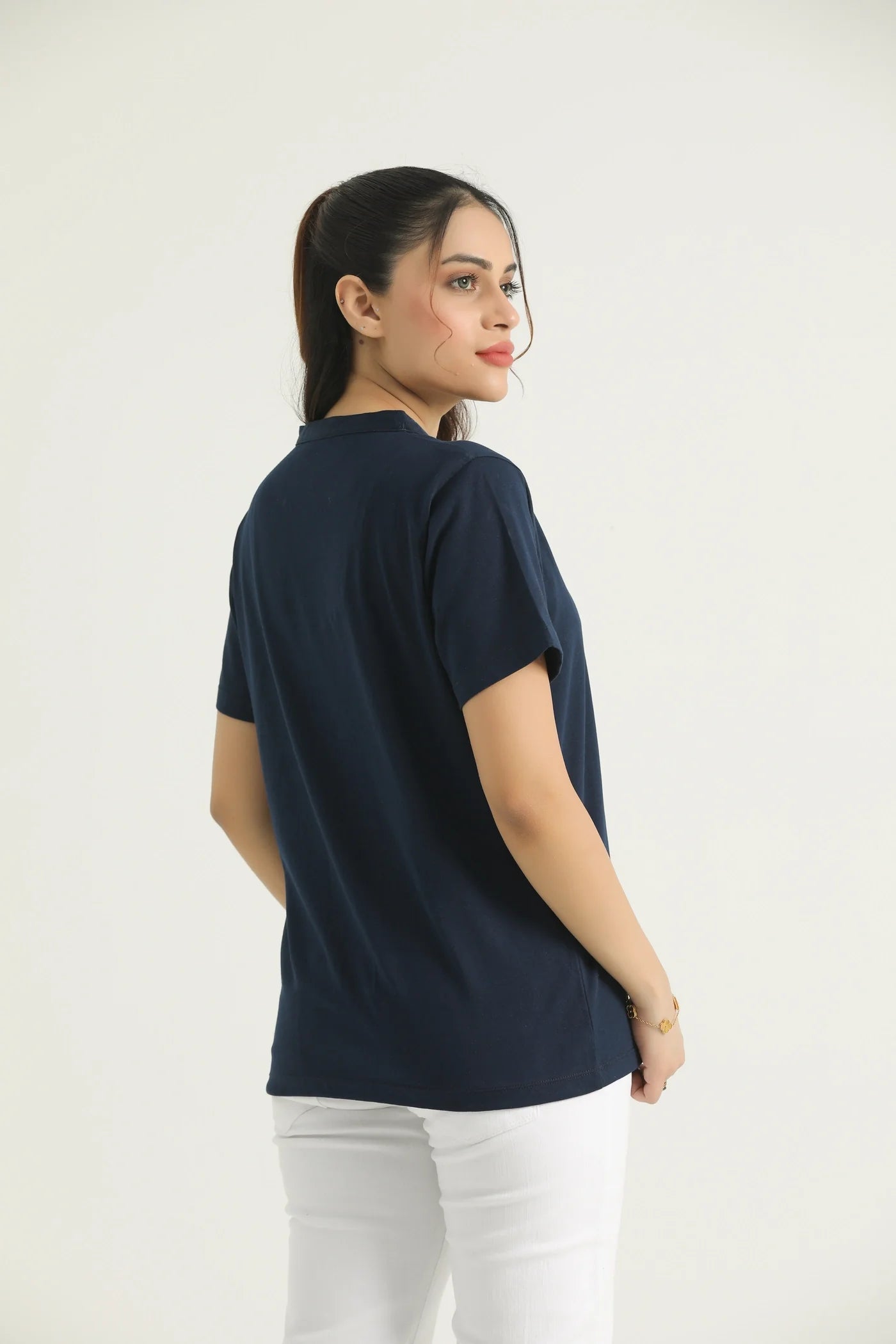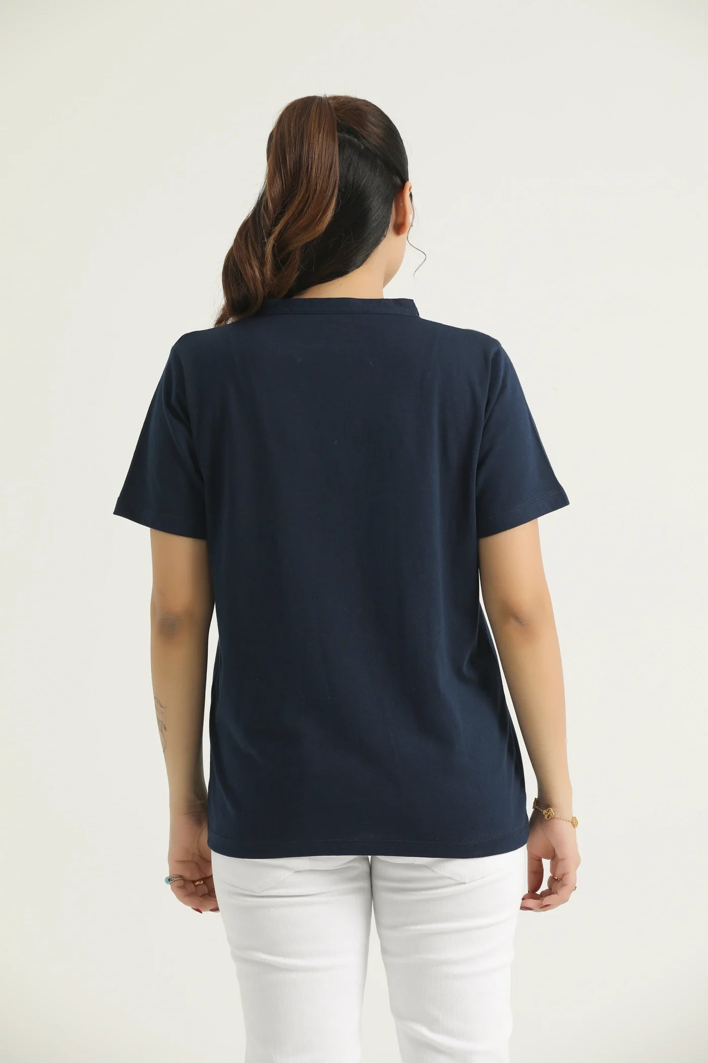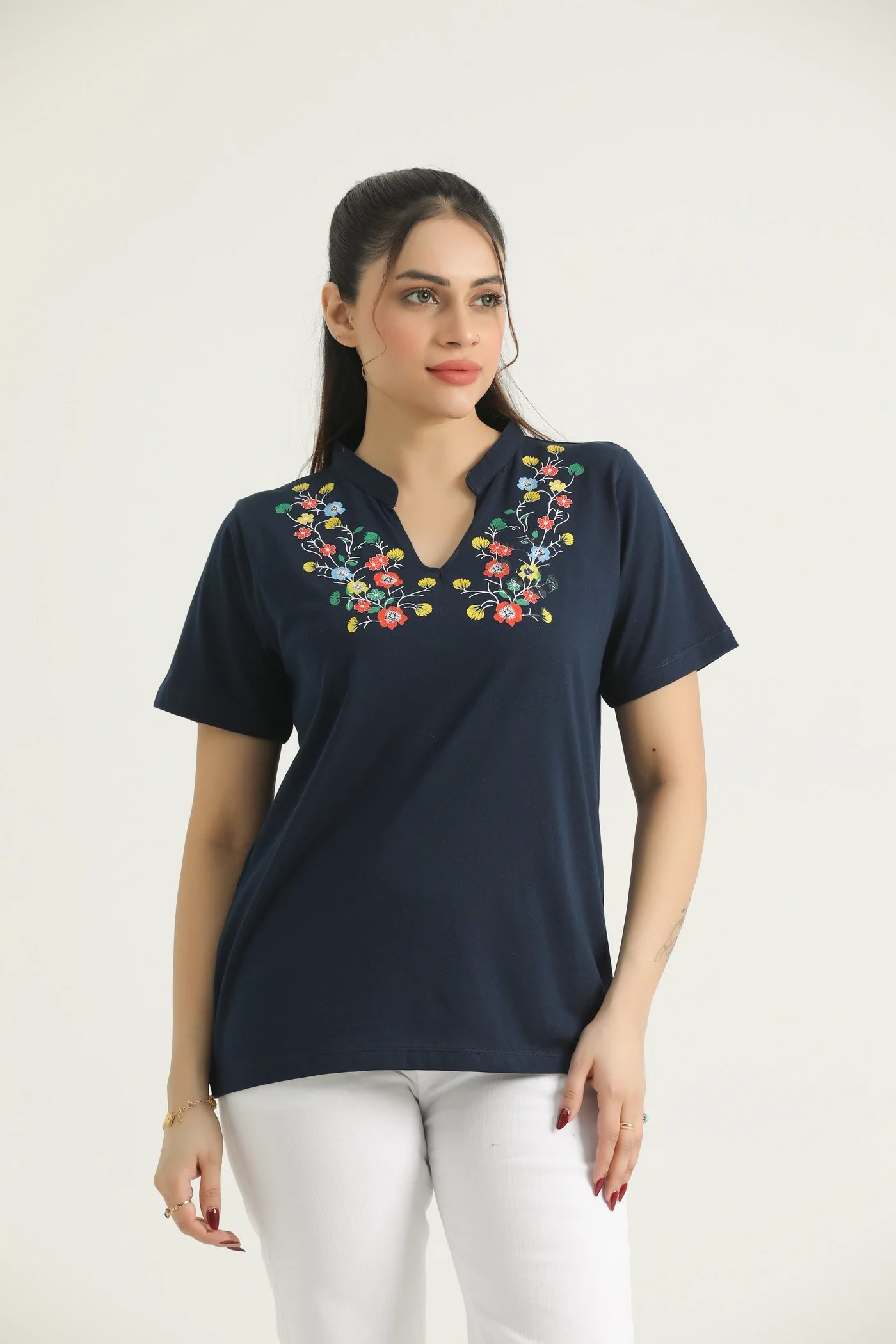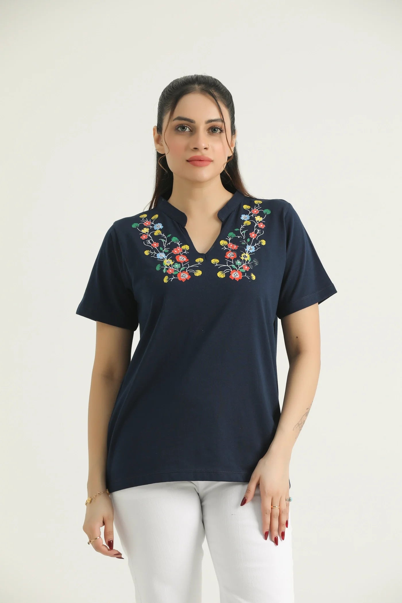 Elevate your everyday style with this charming navy blue top, featuring intricate multicolor floral printed along the neckline. Crafted from soft, breathable fabric, it combines comfort with feminine detail. The notch neckline and short sleeves add a relaxed yet polished touch, making it perfect for casual outings or semi-formal settings.