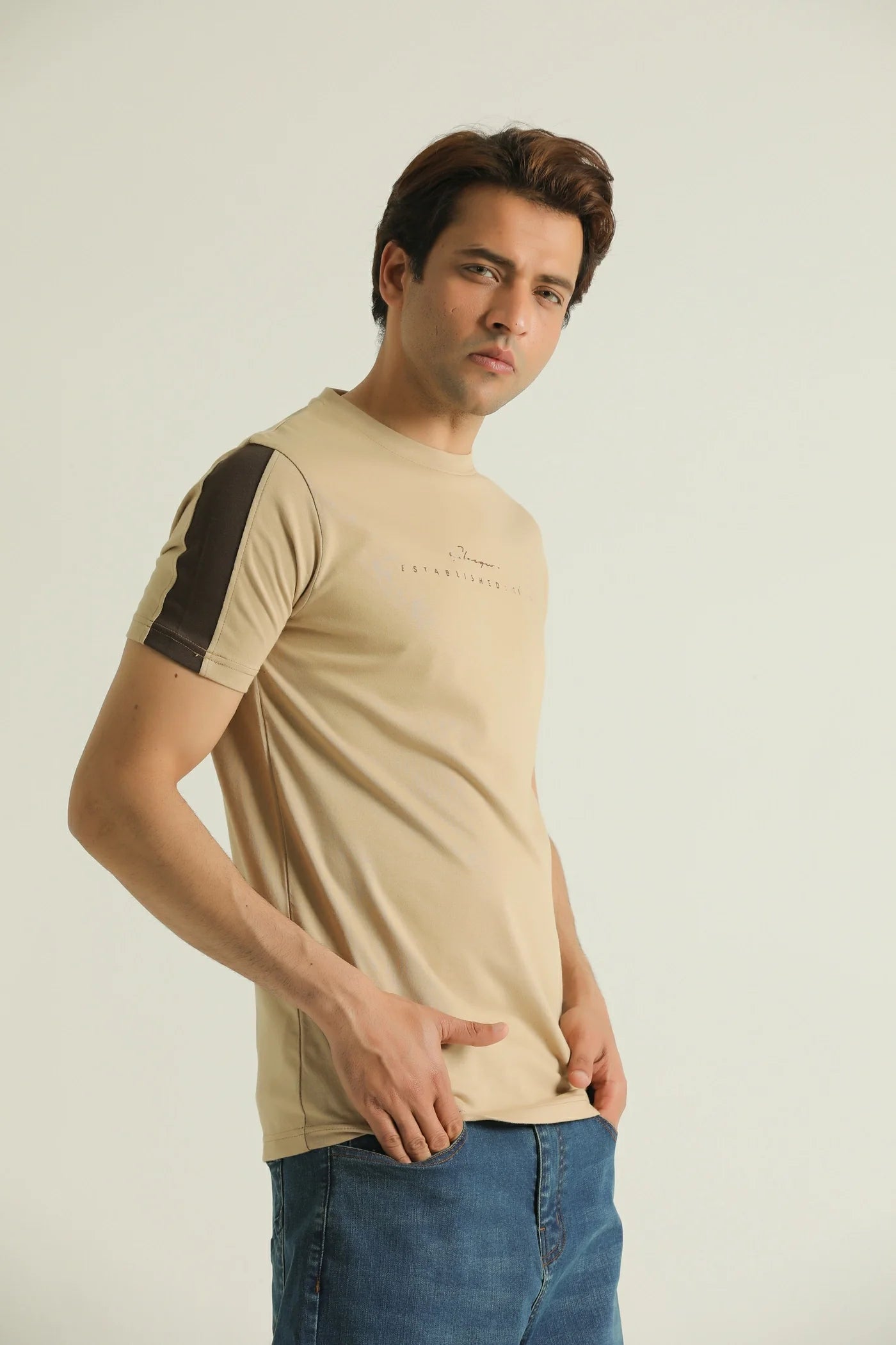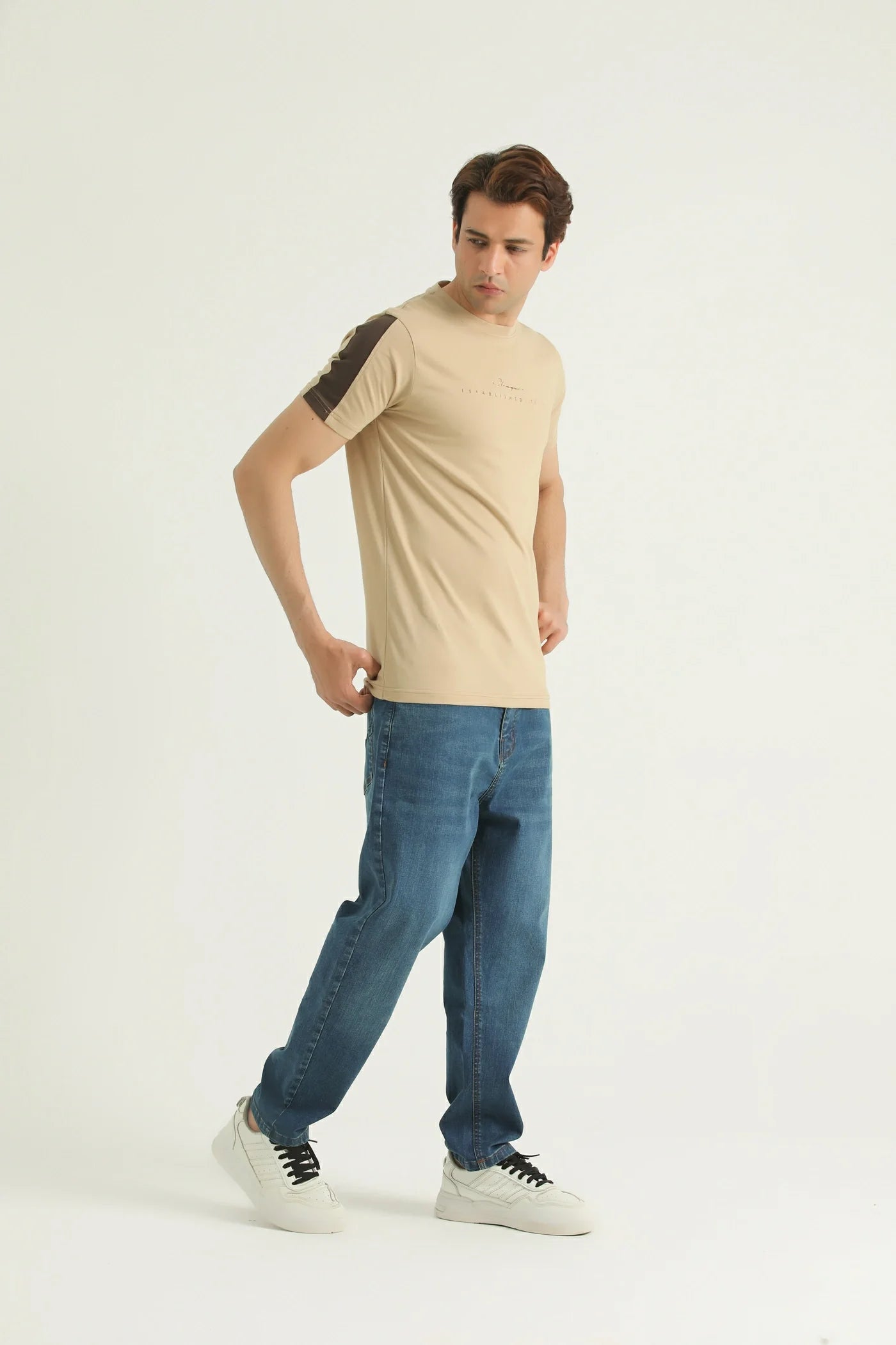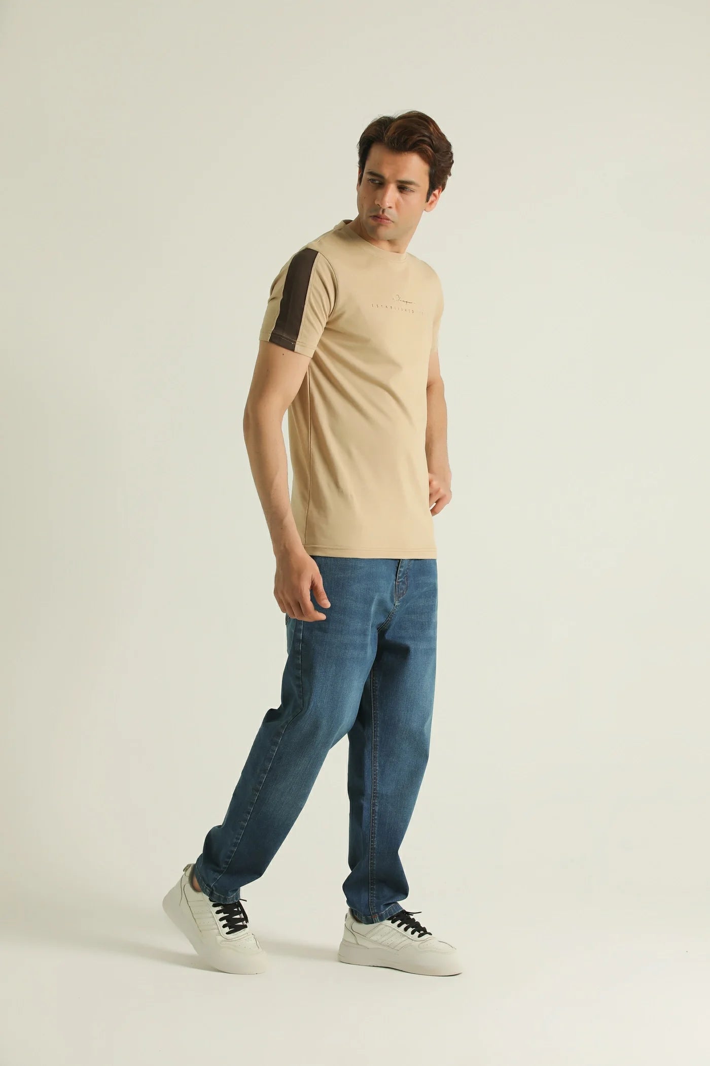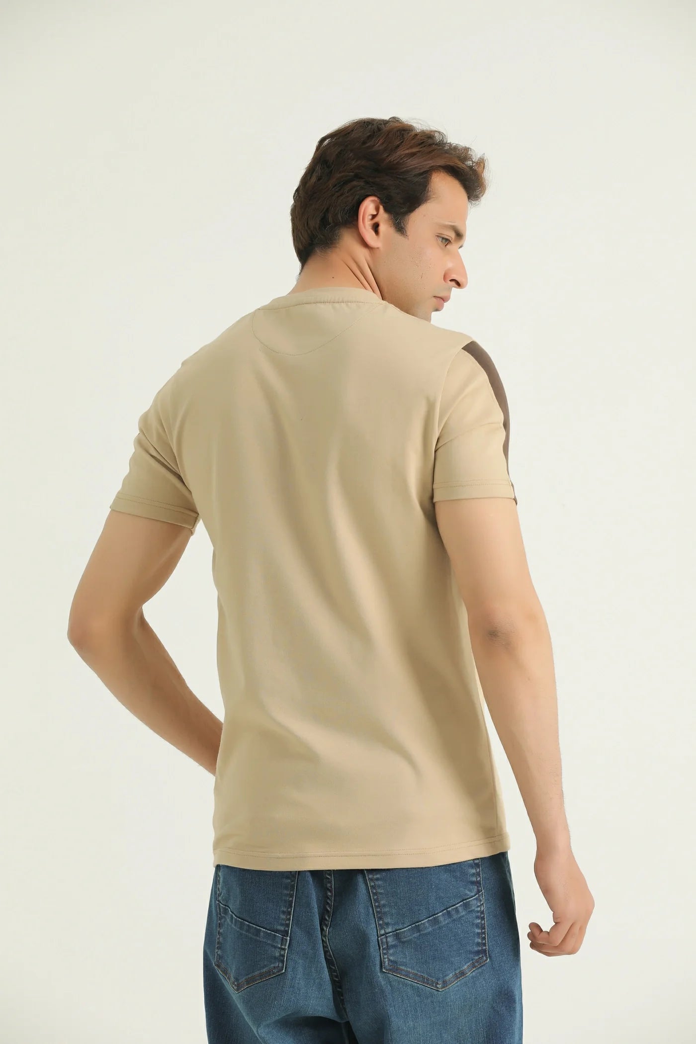 Embrace effortless style with our Earthy Tone T-Shirt, a versatile piece designed for comfort and a subtly rugged aesthetic. Crafted from a soft, breathable fabric in a muted khaki or stone beige hue, this tee features understated distressed details around the collar and a unique, darker contrasting fabric panel along the shoulders and upper sleeves. This thoughtful design adds a modern edge and visual interest without overpowering the shirt's relaxed appeal. Perfect for everyday wear, it's a staple that blends seamlessly into any casual wardrobe.