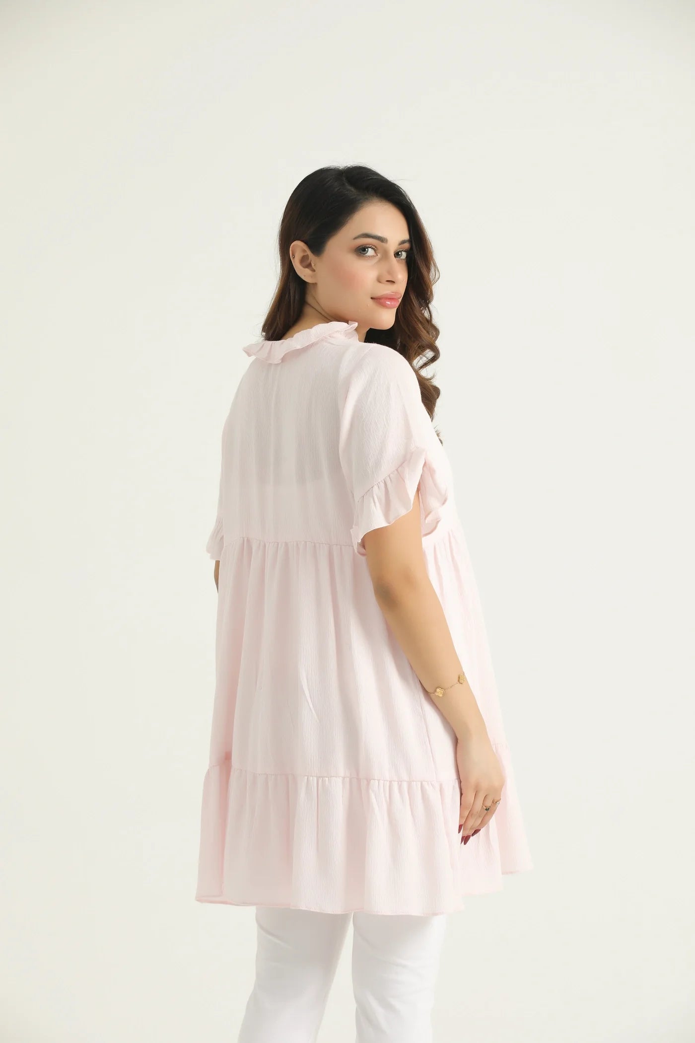 · Silhouette: Loose, relaxed fit, flowing downwards into multiple tiered layers (at least two tiers are visible). This creates volume and movement.