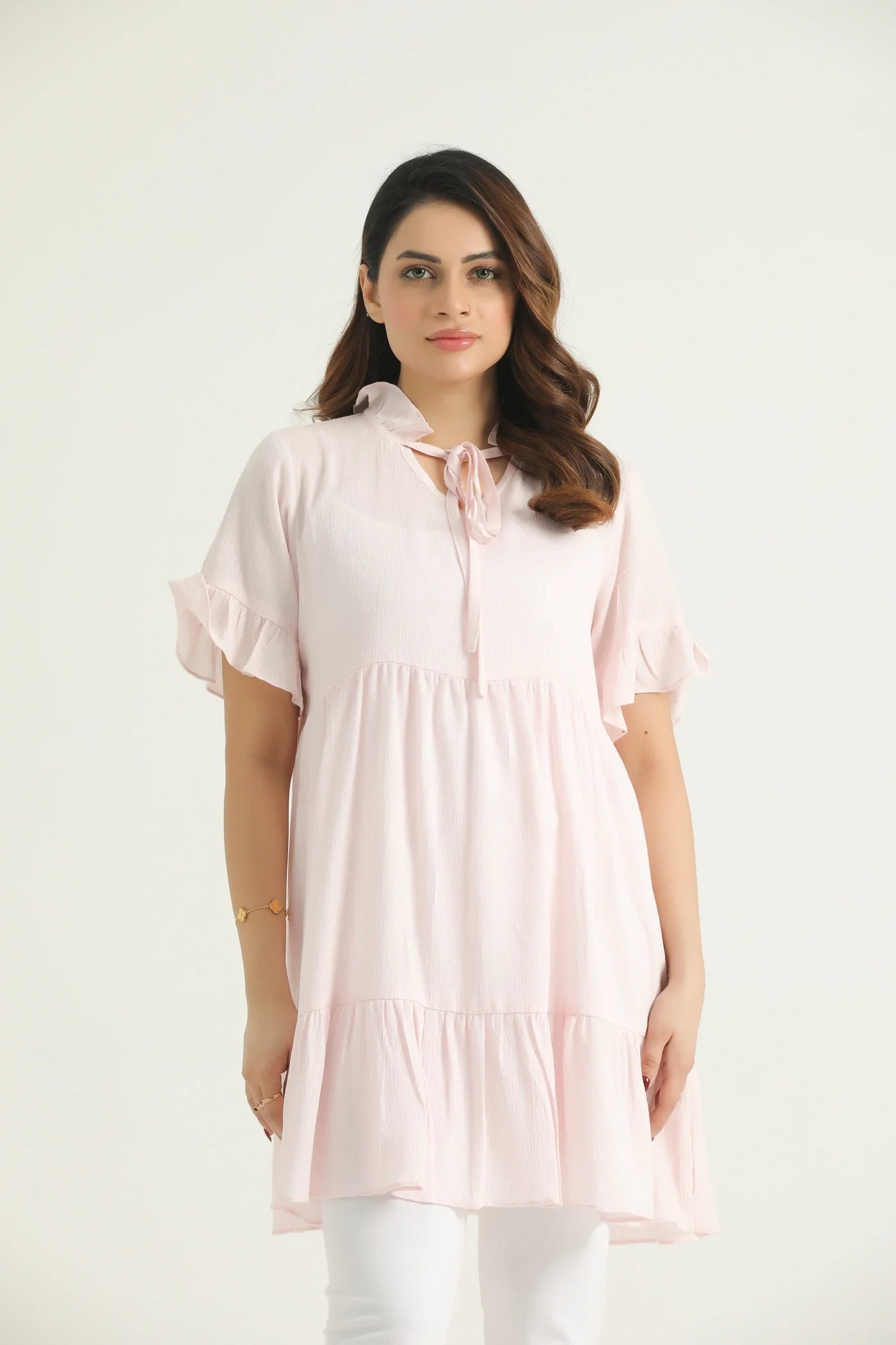 Embrace a delicate charm with our Blushing Breeze Tiered Midi Dress, a vision of ethereal elegance in soft, pretty pink. This beautiful dress features a relaxed, flowing silhouette with graceful tiered layers that add movement and dimension. The charming neckline is adorned with a delicate ruffle and tie detail, allowing for a customizable fit or a whimsical bow. Short, flounce sleeves with gentle ruffles complete the romantic aesthetic, offering comfort and style. Crafted from a lightweight and subtly textured fabric, this dress is designed for ultimate comfort and breathability. Perfect for a leisurely brunch, a garden party, or any occasion where you want to feel effortlessly beautiful and airy.