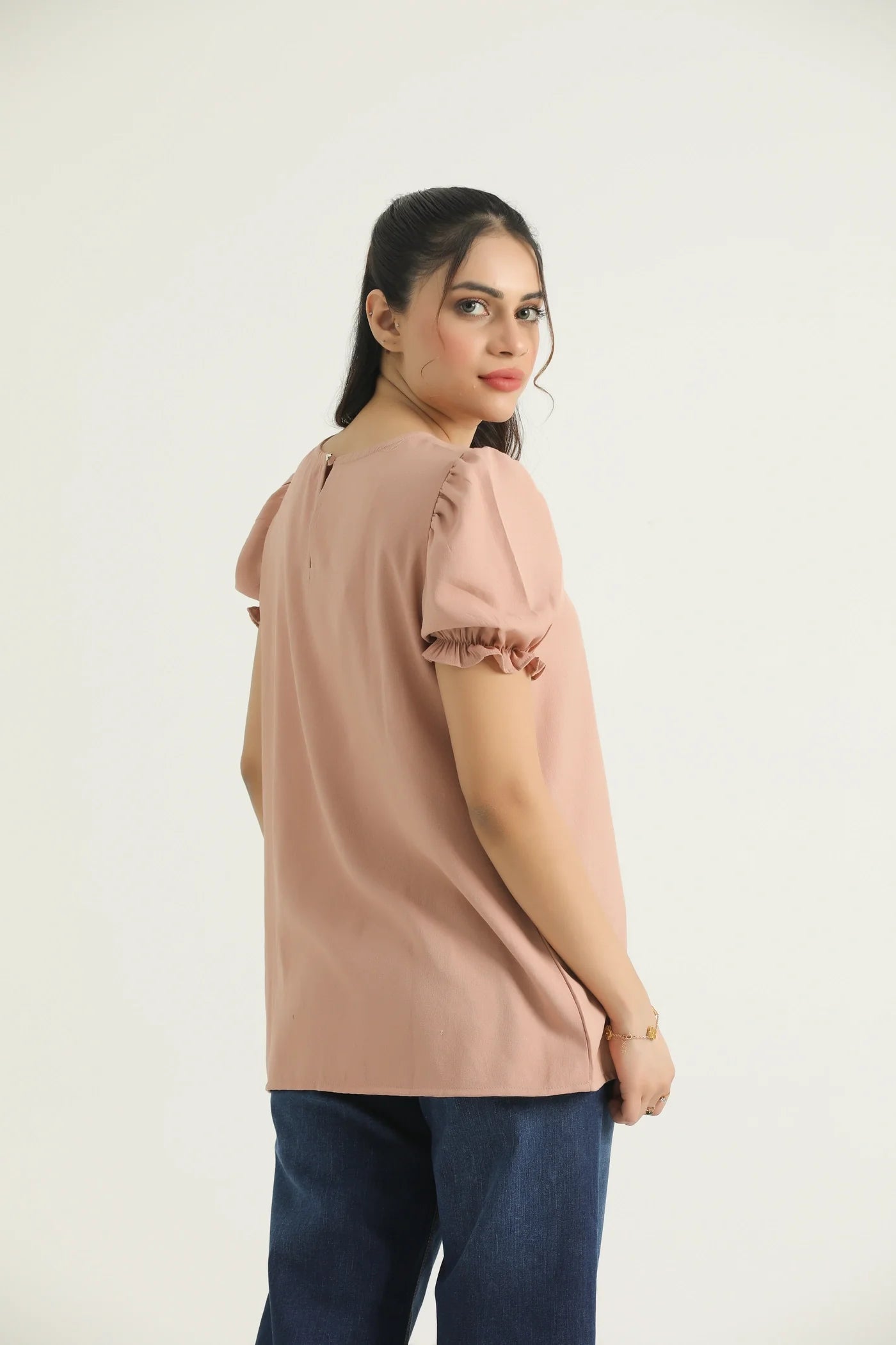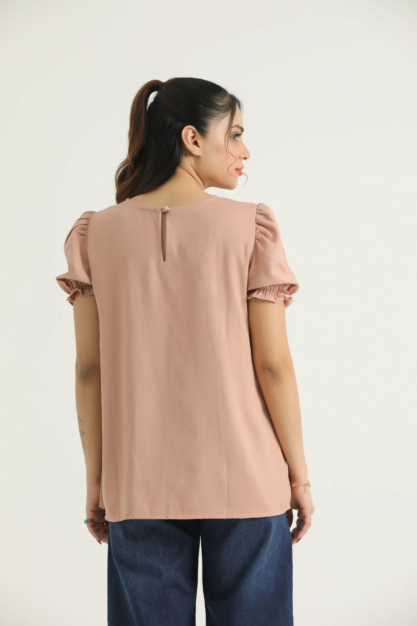 Pair this blouse with dark skinny jeans or high-waisted trousers for a balanced silhouette. Tuck it in and add a statement belt for a chic, polished look. For a more feminine touch, style it with a midi skirt and nude heels or flats. Accessorize with delicate gold jewelry to enhance the soft blush tone.