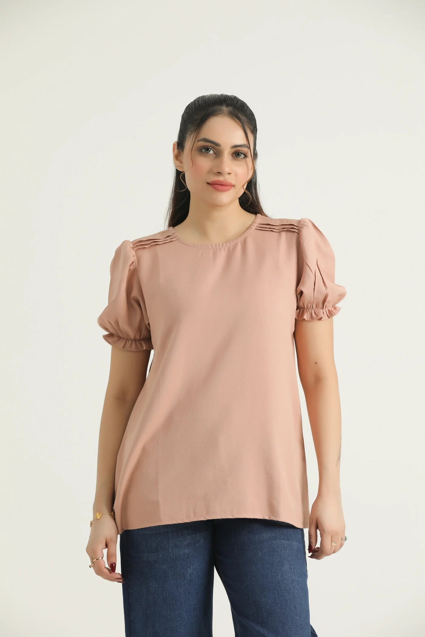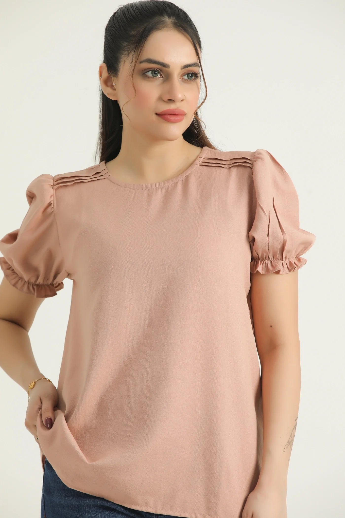 Add a touch of soft femininity to your wardrobe with this elegant blush pink blouse. Designed in a lightweight, textured fabric, this top features statement puff sleeves that are beautifully gathered and finished with elasticated ruffle cuffs. The round neckline is accented with delicate pleating on the shoulders, adding subtle structure and sophistication. Its relaxed fit drapes effortlessly over the body, offering comfort without compromising style. Whether you're dressing for a day at the office or a casual brunch, this blouse blends charm and versatility seamlessly.