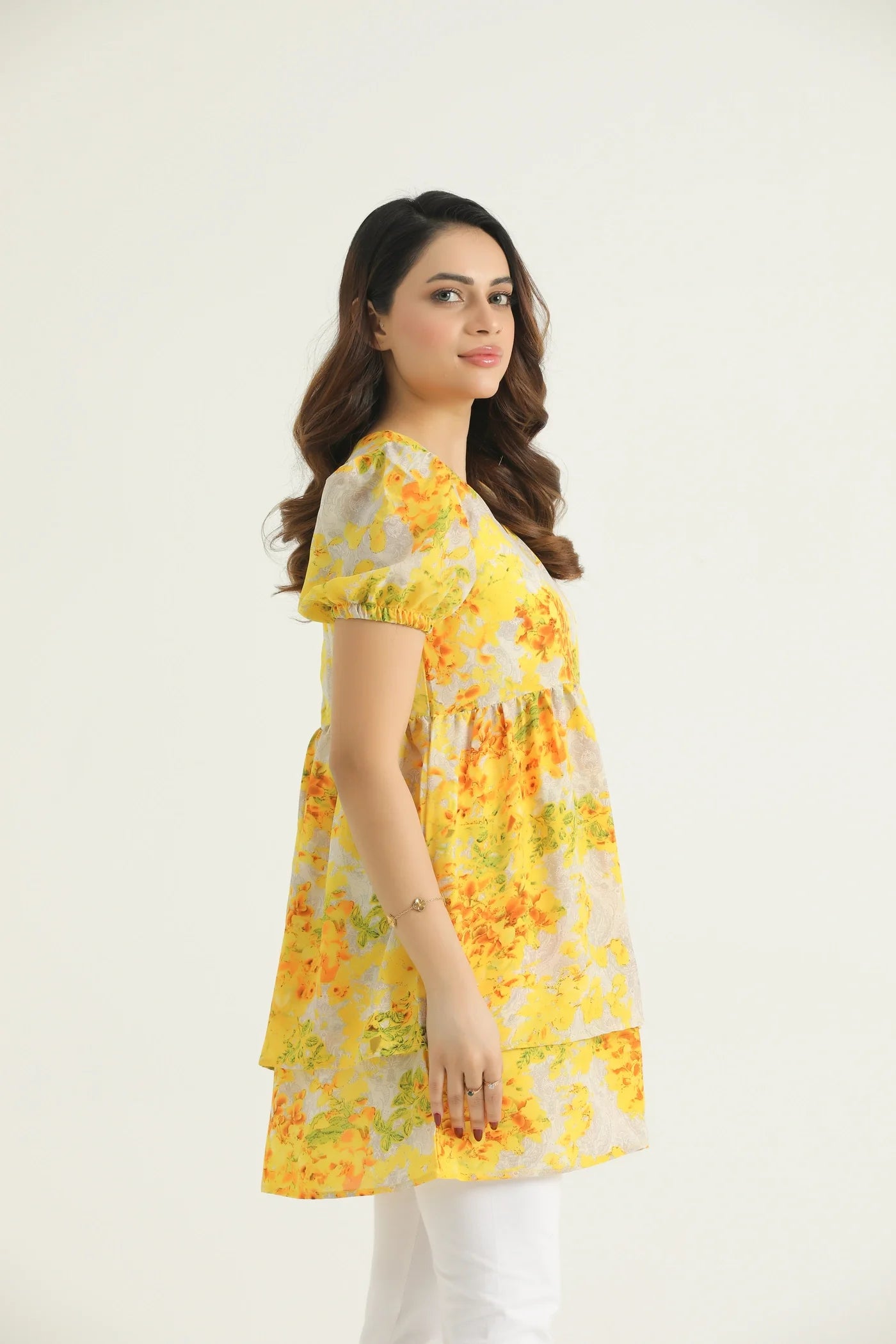 Brighten your wardrobe with our Tunic, a vibrant and charming piece perfect for the season. This eye-catching tunic features a beautiful blend of sun-kissed yellows, soft oranges, and subtle greys in an abstract floral or artistic print. Designed with a flattering V-neckline and short, gently puffed sleeves, it offers a feminine and comfortable fit. The tiered design creates a lovely flow and adds playful volume, making it an ideal choice for both casual elegance and special occasions. Crafted from a lightweight and breathable fabric, it promises comfort all day long.