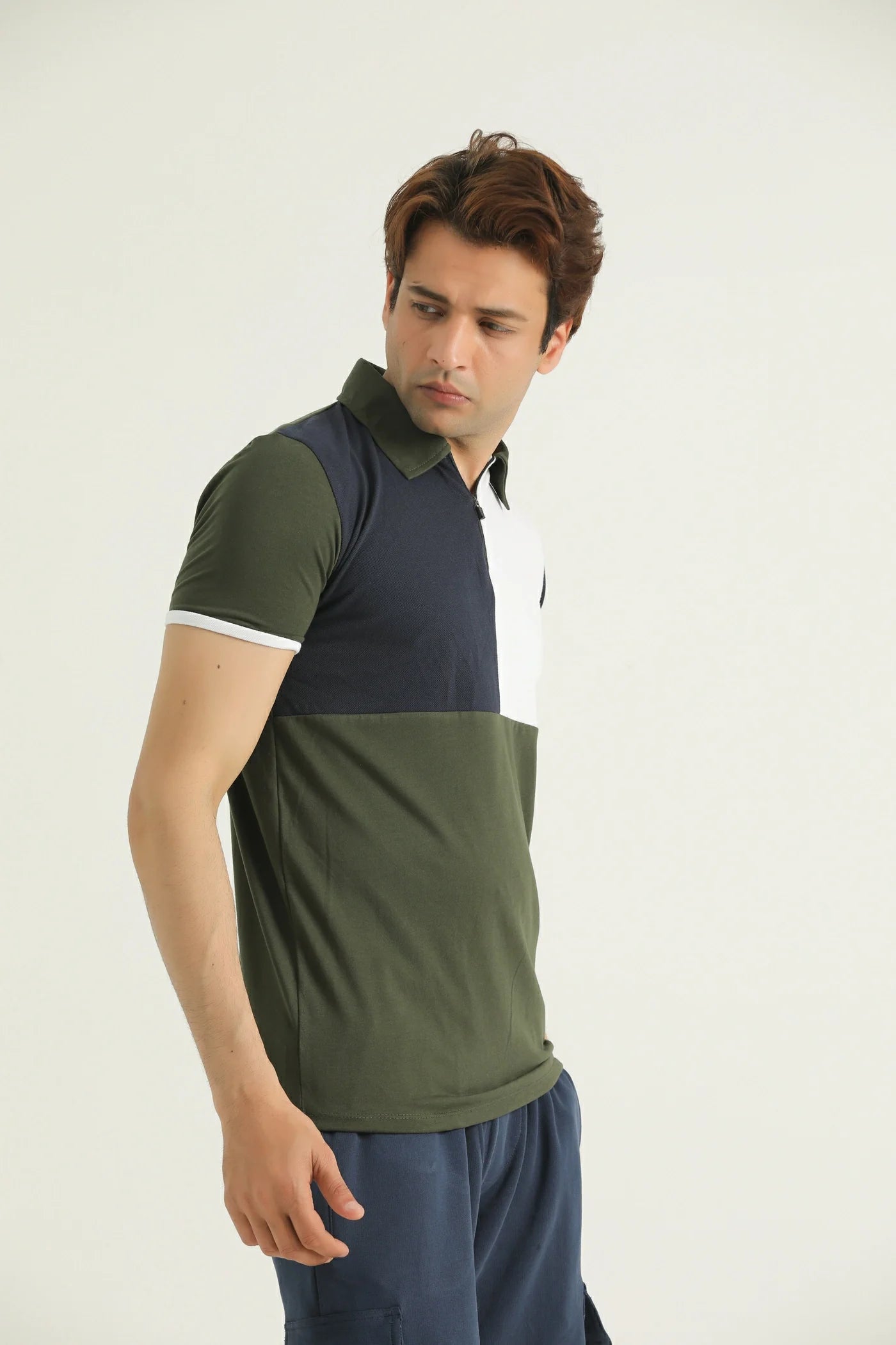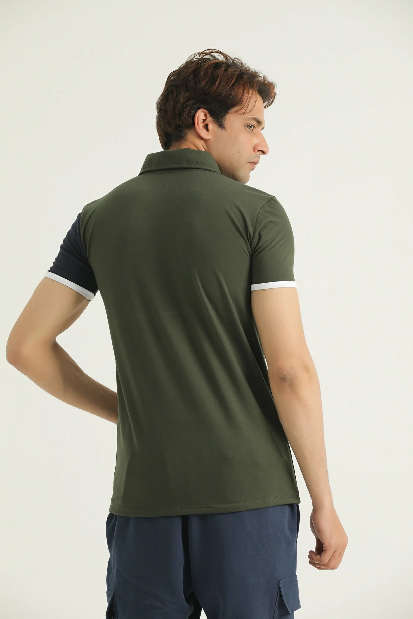 Short Sleeves: Designed for comfort and breathability in warmer weather, ensuring ease of movement. The white trim on the olive green sleeve adds a subtle detail.