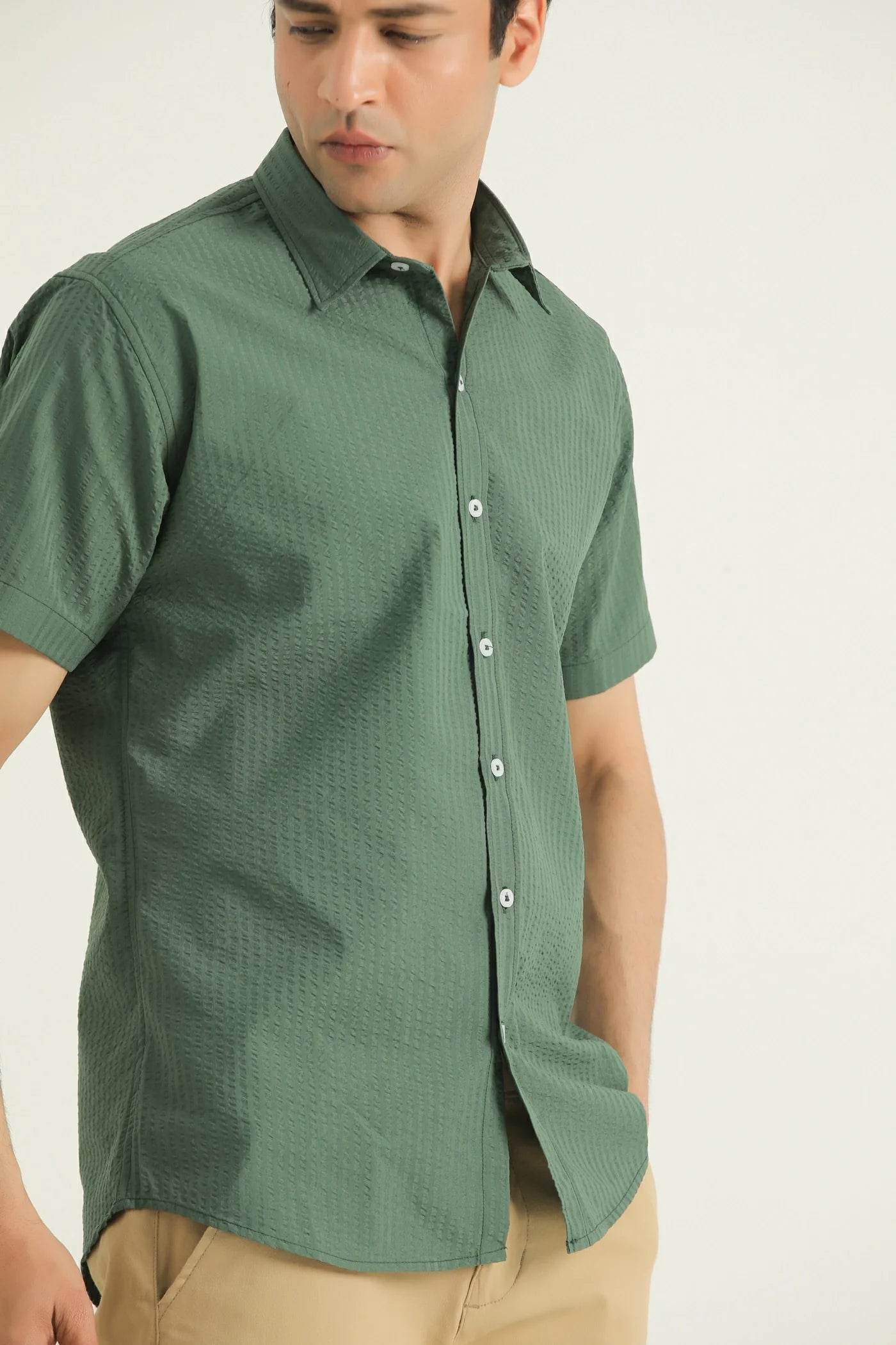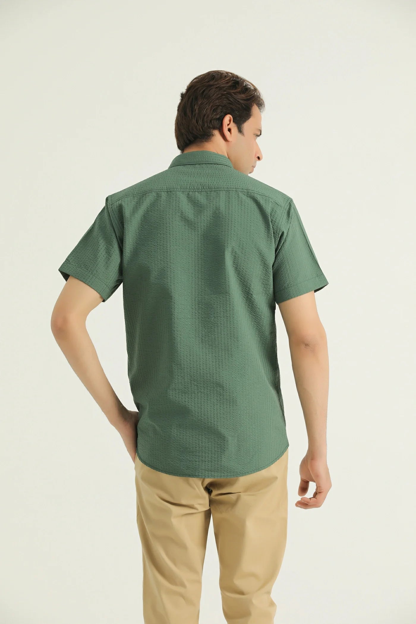 The crisp green color enhances its versatility, making it suitable for casual outings, workdays, or evening events. The shirt includes a structured collar and front button closure, giving it a polished edge while the short sleeves keep it laid-back and cool.