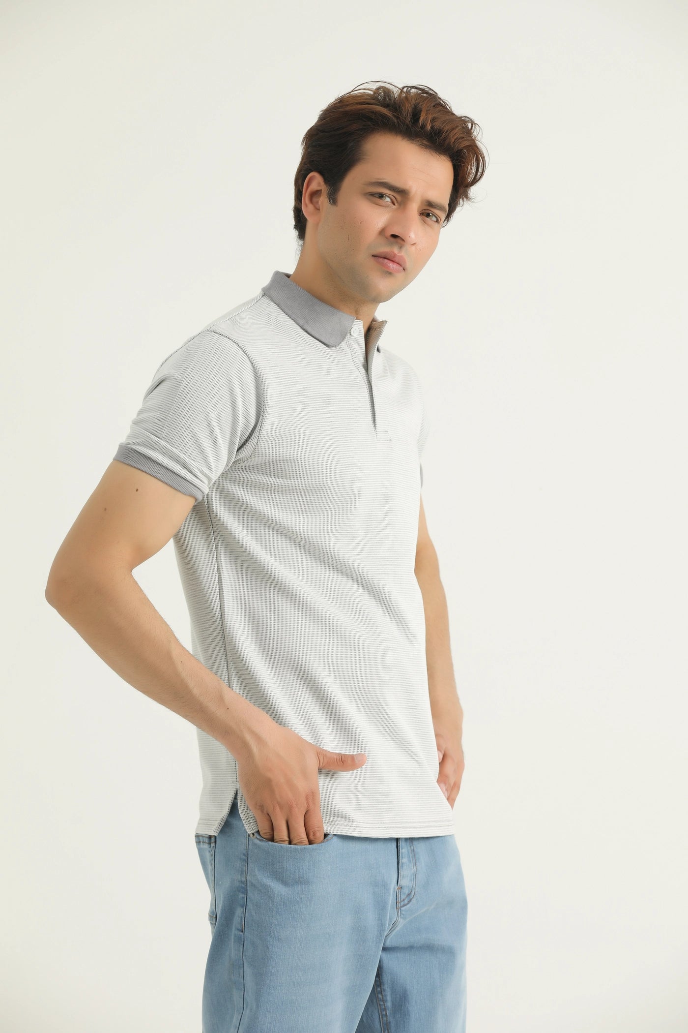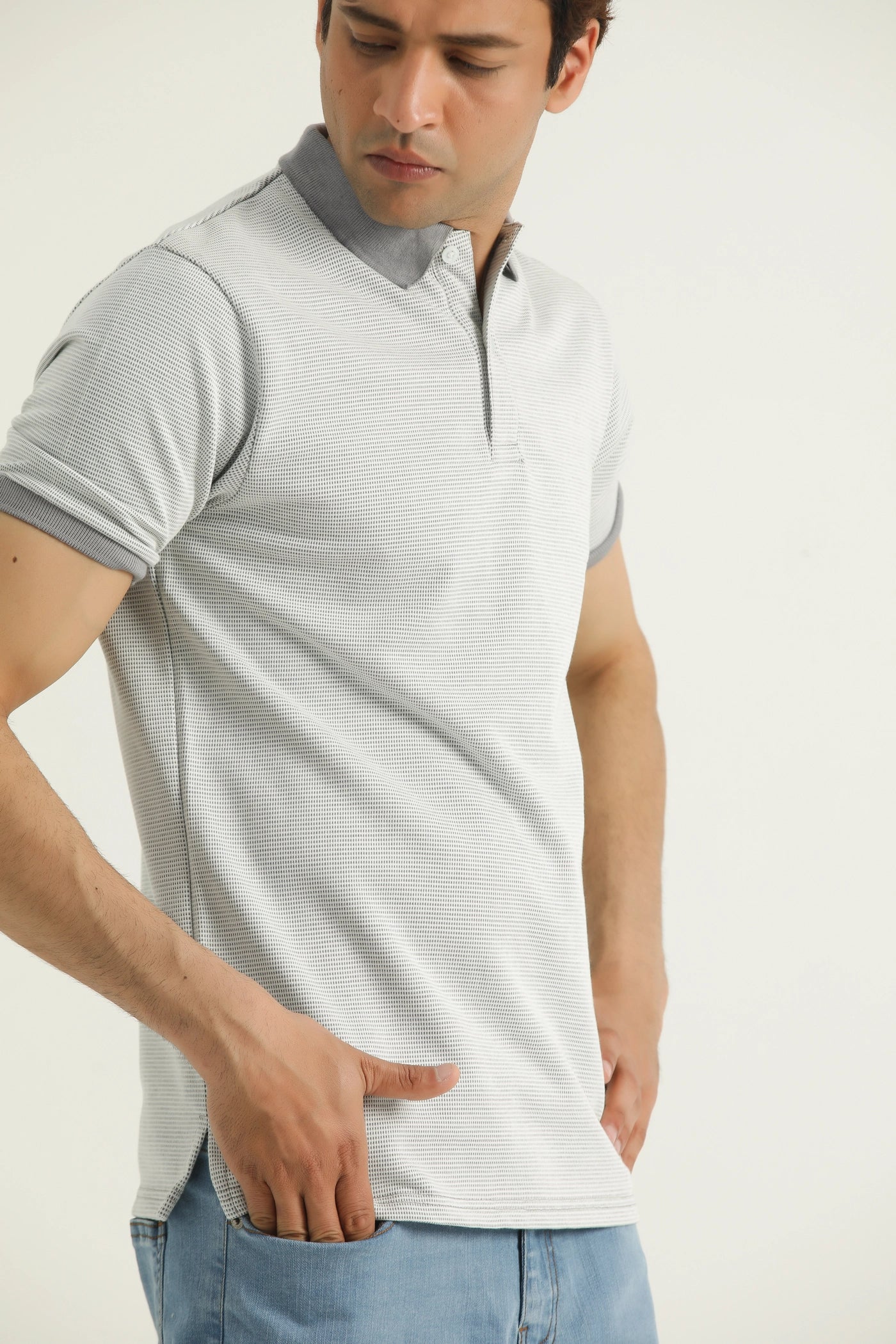 Make a contemporary statement with our Abstract Wave Print Textured Polo, a piece that effortlessly blends modern design with classic comfort. This eye-catching polo features a unique abstract wave or topographic pattern in shades of grey and white, creating a dynamic and sophisticated visual effect. The subtly textured knit fabric adds depth and a premium feel, making the print pop. Finished with a solid grey ribbed collar and matching sleeve cuffs, this polo offers a refined contrast and a cohesive look. Perfect for those who appreciate distinctive style, it's a versatile choice for any fashion-forward casual or smart-casual occasion.