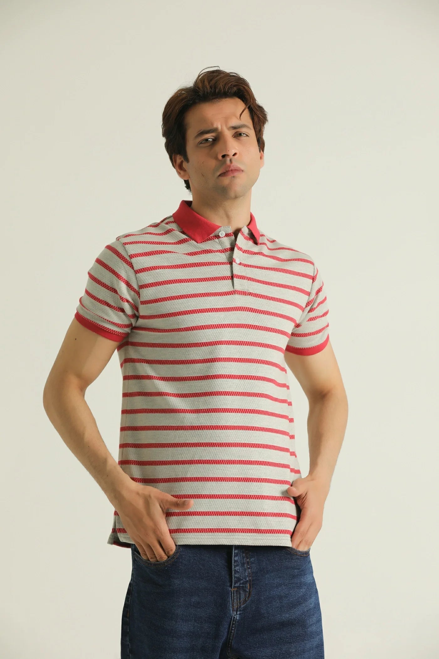 Inject a pop of color and classic style into your wardrobe with our Vibrant Striped Textured Polo. This eye-catching polo features a timeless horizontal stripe pattern in a sophisticated grey, playfully contrasted with bold red stripes. The unique textured knit fabric adds a tactile dimension and a premium feel, setting it apart from ordinary stripes. Designed with a vibrant solid red ribbed collar and matching sleeve cuffs, this polo offers a dynamic and cohesive look that stands out. Perfect for adding a cheerful yet refined touch to your casual or smart-casual ensembles